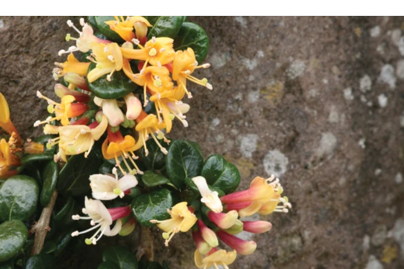 My first introduction to Lonicera crassifolia was several years ago at the Elisabeth C. Miller Botanical Garden in Shoreline, Wash. I had been invited to tour the garden by Richie Steffen, the executive director of the Miller Garden. It was a lovely day in early June, and I was introduced to a plethora of wonderful plants I’d never seen before. There was a lovely vine growing in a pot that I couldn’t name, which Richie identified as Lonicera crassifolia, or creeping honeysuckle. It was in bloom at the time, covered with beautiful yellow-orange flowers that emerge from white buds. Of course, the first thing I did was to put my nose down and take a big whiff and was a little disappointed that the plant didn’t have the same fragrance of some of its cousins of the same genera. My disappointment was brief as I simply enjoyed its fabulous trailing form and dainty flowers. Even the close-up details of the slightly ovate, dime-sized leaves are beautiful, being quite fleshy, almost leathery and covered with small dark hairs.