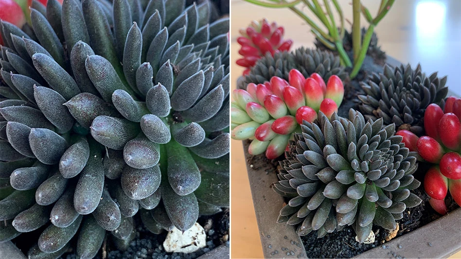 Sinocrassula yunnanensis is commonly called the hedgehog succulent because its symmetrical compact form with densely packed pointed leaves resembles a hedgehog. It is also referred to as Chinese Jade plant. It grows in well-draining rocky soils at elevations from 8,000 to 9,000 feet in the mountainous terrain of Yunnan and into northern Vietnam, Laos, and Myanmar. Because of this high elevation, it is quite hardy. It can reportedly tolerate temperatures as low as 0° F. Like all succulents that survive cold weather, they must be protected from excessive moisture and be planted in well-drained soil. Upon close examination, each succulent leaf is covered with tiny hairs to help the plant collect moisture in the dry season. This is a wonderfully unusual succulent. Channel your inner goth and add this great plant to your collection.