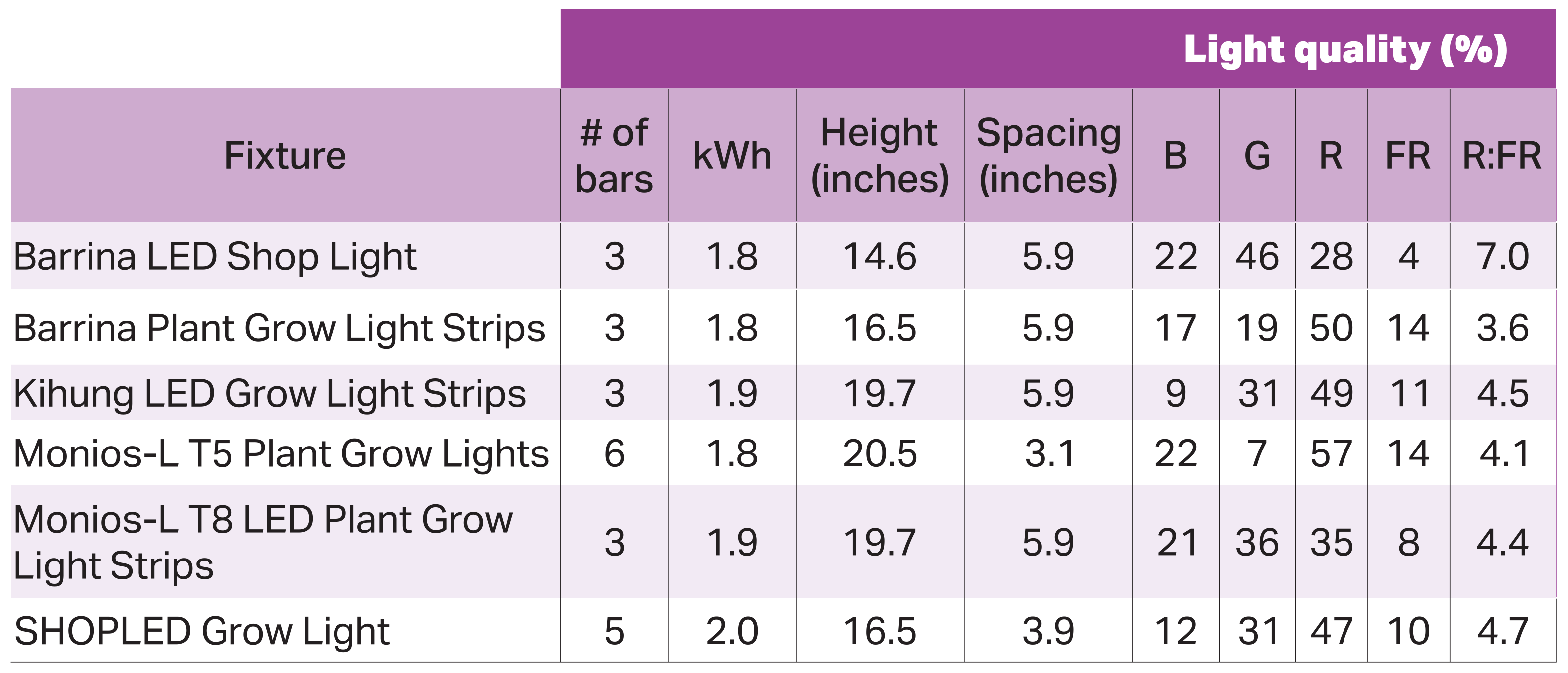 The stem lengths of all species were impacted by the LED fixtures, with seedlings under the Kihung fixture generally being the tallest. The increased stem length observed under the Kihung fixture is likely due to the low blue-light fraction and a moderate red-to-far-red ratio (R:FR). Both high blue-light concentrations and R:FR ratios can reduce stem elongation, producing more compact plants. For the Kihung fixture, blue light accounted for only 9% of the total light delivered, and the R:FR was 4.5; neither was sufficient to promote compactness. Understanding the effects of blue light and R:FR also explains why seedlings under the Barrina LED Shop Light fixture were generally the most compact, as it delivered the highest concentration of blue light and the highest R:FR. Stem caliper, or the thickness of the seedling stems, was also impacted by the fixtures in all species except for sunflower. However, the overall stem caliper impact was relatively mild and was species-dependent on which fixture produced the thickest or thinnest stems.