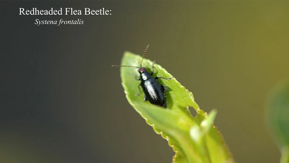 Growers can easily tell if they have a red-headed flea beetle infestation. The leaf injury is very prominent, which typically leads to further inspection. The adults often drop to the ground, which can make them harder to find.