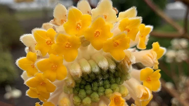 E. chrysantha, (yes, I have chosen a lane) is native to the Himalaya of China and Nepal. Some references include Japan in this list, but reliable sources have the plant being imported into Japan in the late 1500s where it was prized for its bark which is used to make Japanese tissue called mitsumata paper. The genus was named after Irish-born amateur botanist Michael P. Edgeworth and his better-known sister Maria Edgeworth, a prolific 19th century author. There are several notable cultivars of E. chrysantha, my favorite of which is ‘Red Dragon’ with orange-red flowers.
