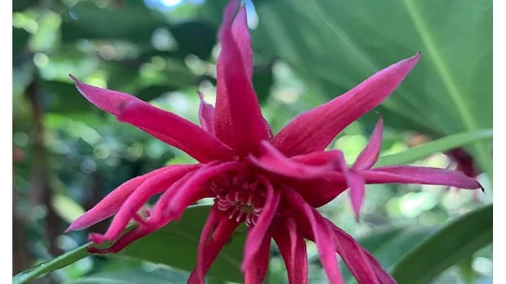 While I. verum has amazing characteristics, I want to introduce you to another Illicium species, I. mexicanum. It’s smaller and more shrublike, reaching only 6-8 feet tall. It is a beautiful ornamental, having dark red flowers that persist from spring through early fall. I’ve been watching a specimen at Sebright Gardens in Salem, Oregon, all year. It survived a horrific ice storm in February and several days of unprecedented heat in late June when temperatures soared over 118°F for two days. The photos accompanying this article were taken in mid-September, and the plant looks unfazed. It’s planted in rich, well-drained soil, under a canopy of oak and fir trees, and those are ideal conditions for Illicium mexicanum. There is not a lot of this species in cultivation, but it is hardy to at least 10°F and colder with some protection. It’s glossy, evergreen leaves are willow shaped and about 8 inches long, and the shrub is very balanced and eye-catching in the space it occupies. There is exciting potential for this beautiful ornamental in commercial horticulture.