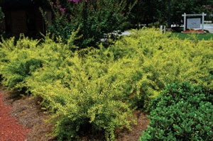 Another yellow/gold leaf Spiraea japonica and the garden world is rendered sun blind. With some 40 types, and the number increasing yearly, where’s the uniqueness? The overarching need is a yellow foliage selection that does not discolor or bake in the heat. Even in Northern climes, most yellow cultivars are more green or a mottled mosaic of green-yellow as summer wanes. Are there other options?