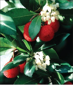 This is one of the few large shrubs that flowers in early winter, just at the time the fruit is ripening. Strawberry tree also has attractive, cinnamon-colored bark and rounded, glossy, medium-green leaves.