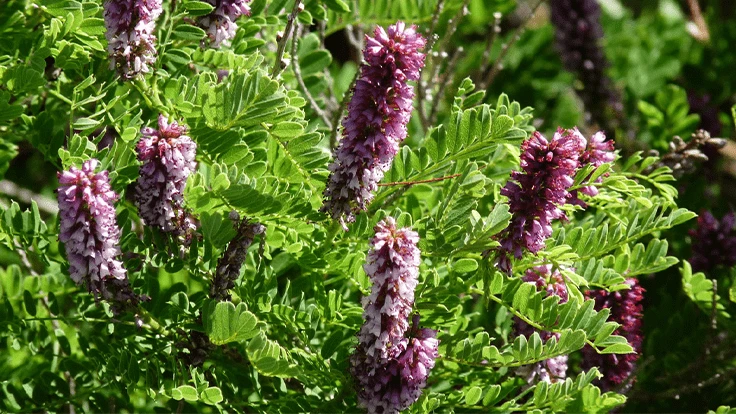 The dwarf leadplant is quite unusual in that it can take nitrogen from the air and transform it into a nitrate fertilizer with the help of a symbiotic soil-dwelling microbe called Rhizobium. As a result, this dryland shrub looks green and healthy even in the most impoverished soils. Beyond its drought tolerance and air-cleaning abilities, it offers spikes of honey-scented purple flowers in June. It performs well in full sun. Growing 2 to 3 feet tall and wide, it’s hardy in Zones 3-6.