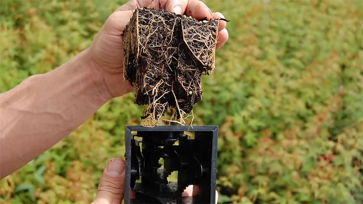 The most critical step is propagation. Very young and actively growing root tips respond to air-root-pruning by producing many secondary roots. Research has shown that roots should be air pruned no more than 4 inches below the seed and on the sides of the pots as well. This pruning results when root tips are guided into openings in the container where the tip dehydrates and dies. The key to air-root-pruning is our container design.