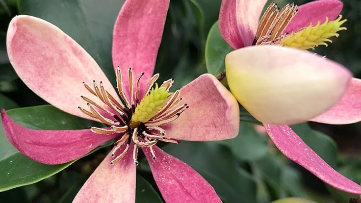 This new Magnolia figo, commonly called banana shrub, is covered with pinkish to ruby banana-scented flowers in late spring reblooming into the summer and early fall. Naturally dense, its full foliage grows quickly, finishes fast for retail but requires little pruning. Hardy to USDA 7a to 9b, ‘Stellar Ruby’ will grow to 10-15 feet high x 6-8 feet wide in 10-15 years without pruning but is easily maintained in home gardens as a smaller shrub with annual or bi-annual pruning.