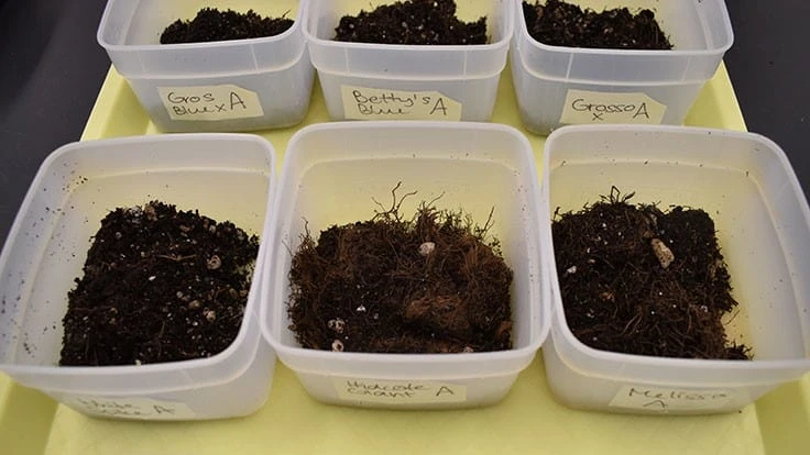 Jeffers has growers send a picture showing the size and configuration of their tray. His team then figures out how many plugs will be necessary for a representative sample. Currently, they shoot for 25-30%. Next, they have the growers pick up the selected plugs, cut off the bottom quarter-inch of the roots, then stick the plugs right back in the cell.