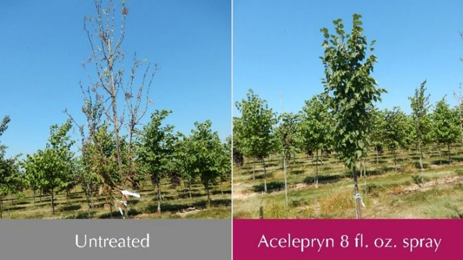 As a foliar spray, Acelepryn provides up to four weeks of control on lepidopteran pests. When applied as a drench or soil treatment in the fall, the product moves upward into the canopy providing even longer residual control into the spring. Acelepryn can also be applied as a bark treatment to protect from pests like clearwing borers. This long-lasting, effective control can lead to time savings and labor efficiencies.