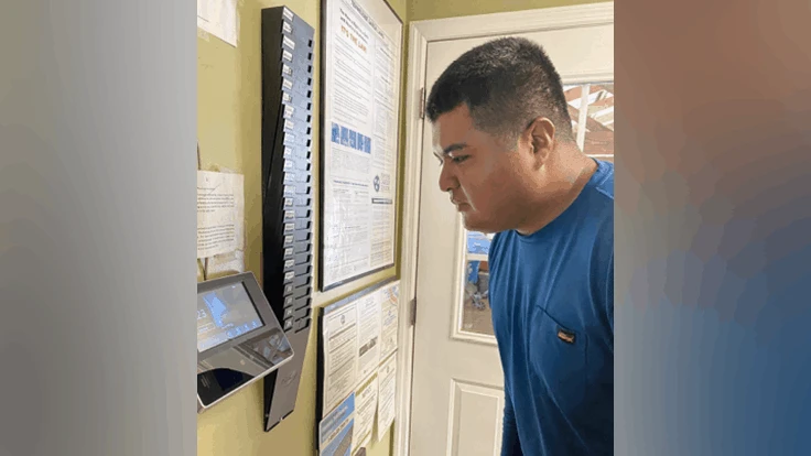 It takes about two minutes to get each of Blankenship’s 25 employees registered into the system. That process involves the employee standing in front of the screen and moving their face around while the machine scans it from different angles. Once an employee is in the system, it takes about two seconds for them to clock in or out.