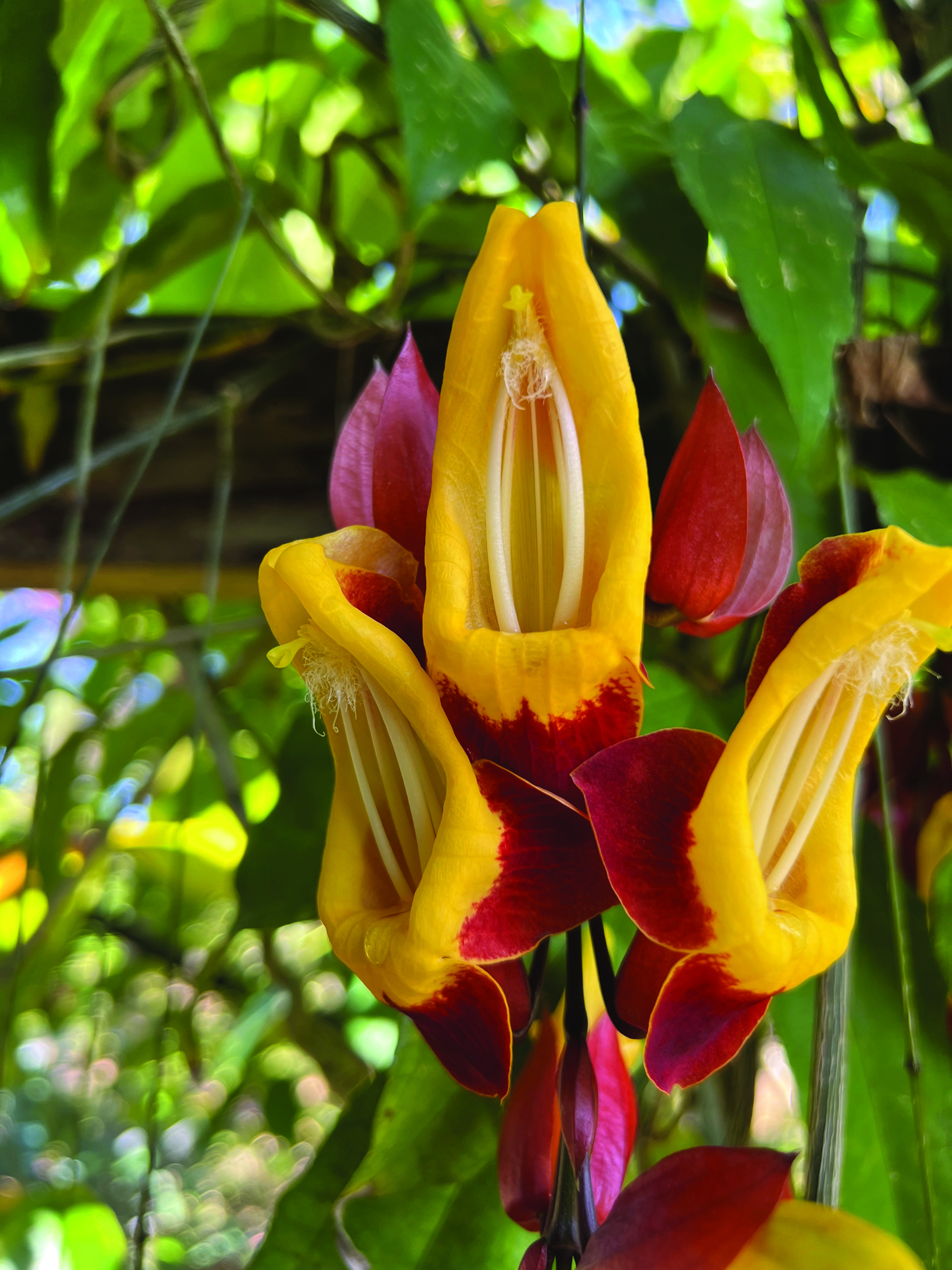 Among the many tropical vines I’ve seen and grown over the years, none make me swing more than Thunbergia mysorensis. Often called the “brick and butter vine” or Mysuru (Mysore) clock vine, it will take your breath away when you see it in a tropical garden or in the wild. Long pendulous chains of waxy blossoms drip from the plant like living jewelry, each flower a blend or deep mahogany red and bright golden yellow. Our friend Tom Piergrossi at Vintage Green Farms near Hilo, Hawaii, had a stunning specimen in full bloom when my partner, Michelle, and I visited last February.