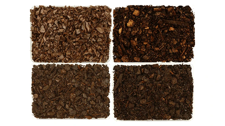Before discussing our experiments and results, it is important to first understand how the aging process affects pine bark. Pine bark aging is not composting (no nitrogen is added) but is conducted similarly in that bark is piled up in windrows, wetted during dry weather and turned periodically to prevent excessive heat buildup and allow for consistent aging of the whole pile (Figure 1). Pine bark (or other barks) may be aged anywhere from six weeks to one year depending upon availability, product demand and/or grower preferences. A detailed description of the aging process and what effects it has on pine bark have been detailed before: nurserymag.com/article/nm1014-pine-bark-variations-differences. Here, we will just focus on the fact that aged bark usually has more fines (typically considered less than 0.5 mm in size), a higher white wood content and usually has a higher water holding capacity (due to the higher percentage of fines).