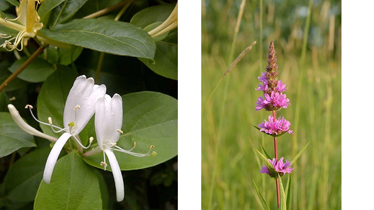Photo: Honeysuckle (left) by Aftabbanoori; purple loostrife (right) by Ivar Leidos
