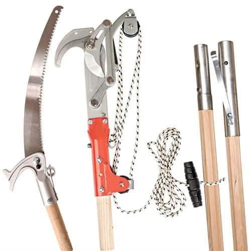 This combination pole pruner kit features two separate heads: A bypass pruner for cuts up to 1-3/4-inches and a 13-inch tight-curved tempered blade for larger branches. We plated both blades with chrome for long-lasting sharpness and durability! We designed the cutting blade with high-quality SK-5 high-carbon Japanese steel for long-lasting sharpness. This tempered 13-inch curved saw blade quickly draws itself into the cut for much faster cutting. A two-pulley configuration gives you extra leverage on large cuts. We also added a sap groove to the bypass pruners to keep the cutting area clear of excess buildup. This kit includes: