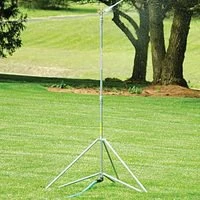 The Tripod Sprinkler Stand has the water inlet located in the center of the tower. No need to anchor feet to prevent tipping, the hose attached to the center of the tower and extra wide feet balances it. Galvanized steel body and legs give corrosion resistant properties