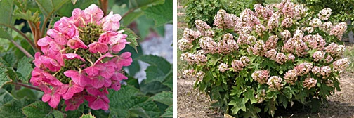 ‘Ruby Slippers’ and ‘Munchkin’ are small in stature and have large flower heads that stay upright, even after heavy rains. They grow 3-4 feet tall and 4-5 feet wide after nine years of growth, with flower heads held upright above their leaves. Flowers on ‘Ruby Slippers’ open white but quickly turn pale pink and deepen into rose, while those on ‘Munchkin’ open white and gradually turn medium pink. Both plants flower in early summer.