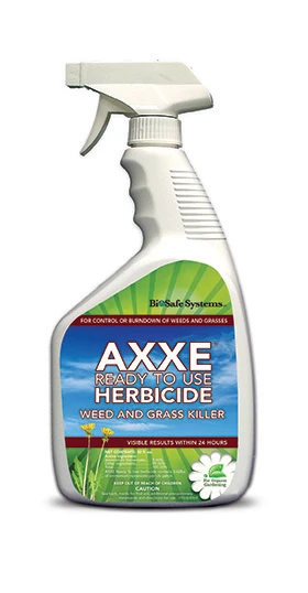 AXXE Weed & Grass Control is available in a 32 fl . oz. ready to use, 32 fl . oz. Tip-n-pour concentrate, and 1 gallon concentrate. For information about AXXE Weed & Grass Control, contact BioSafe Systems at 1.888.273.3088.