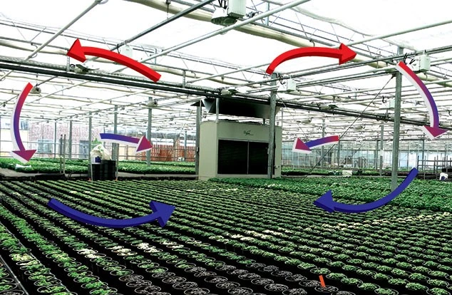 The DryGair unit takes humid air and condenses it into water, then returns the dry air back into the closed system. The unit accomplishes this by creating a homogeneous climate condition which prevents diseases. This allows for a significant reduction in pesticide use.