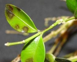 This disease is spread primarily by water (rain splash, irrigation, runoff, etc.), by the movement of plant material in the trade, and through contaminated tools, vehicles, boots, etc. Initial symptoms of the disease on boxwood plants include leaf spots and blights, rapid defoliation, distinctive black cankers on stems, and severe dieback. Most boxwood plants are not killed by the disease, but will become so defoliated as to be aesthetically unacceptable.