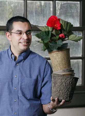 Pictured: Purdue's Roberto Lopez found that consumers are willing to pay more for a variety of sustainable pots that use recycled materials and have a smaller carbon footprint than traditional plastic pots. (Purdue Agricultural Communication photo/Tom Campbell)