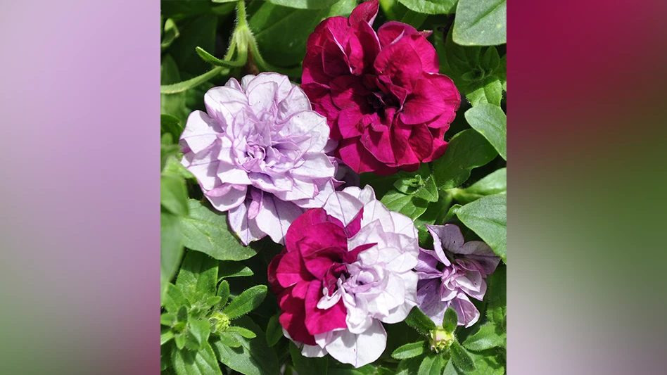 Double Surprise (pictured) is the newest addition to the petunia Blanket series from Green Fuse Botanicals. Double Surprise produces a combination of color from a single plant, including silver, white, purple, lavender and even bicolors. Grow this self-cleaning plant in 4- or 6-inch pots, in hanging baskets or use in combos.