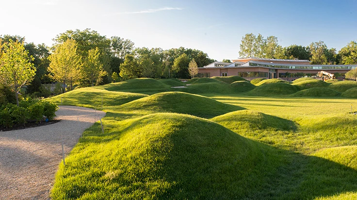 The front lawn of the Chicago Botanic Garden's new Regenstein Learning Campus looks like a Dr. Seuss landscape come to life, or maybe one plucked out of "Teletubbies."