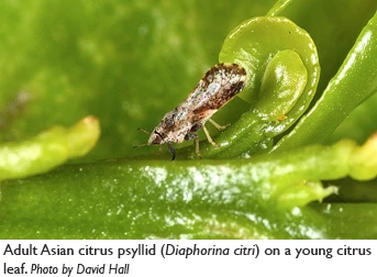 In October Ariz. Dept. of Ag detected a single adult Asian citrus psyllid (Diaphorina citri) on a trap on a residential citrus tree in the town of San Luis in Yuma County. This detection is the 1st record of the psyllid in Arizona. Further surveys of nearby properties by Ariz. Dept. of Ag and APHIS inspectors revealed additional psyllid adults. Psyllids found to date have tested negative for the presence of citrus greening.
