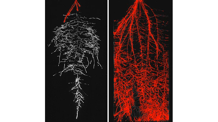 Photo: Roots systems of plants revealed using the GLO-Roots luminescence imaging system, which uses a firefly protein to visualize roots in soil. The root system on the left is from an early stage plant that is just beginning to initiate crown roots, whereas the plant on the right has a crown root system that is fully established. Crown roots are false colored in red. Image is courtesy of Jose Sebastian.