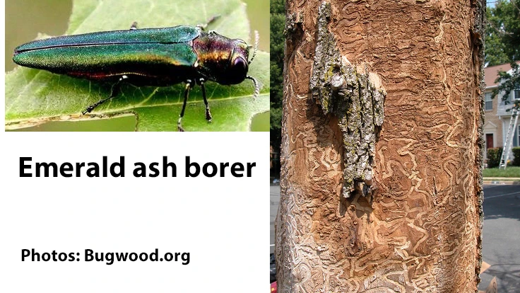 EAB is a small, metallic-green beetle that is about ½ inch long. The larvae chew into the layer of wood under the bark, cutting off the flow of water and nutrients. EAB infested ash trees include thinning or dying branches in the top of a tree, evidence of woodpecker activity, S-shaped feeding galleries under dead or splitting bark, D-shaped exit holes, and water sprouts (along the trunk and main branches).