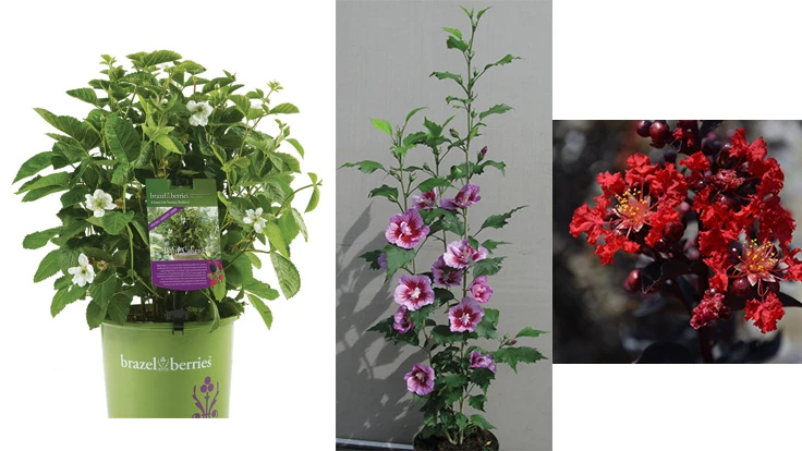 Top photo (L to R): BabyCakes Blackberry, Purple Pillar Rose of Sharon, First Editions Sunset Magic Crape Myrtle