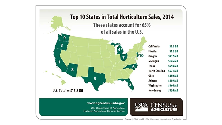 WASHINGTON –The U.S. Department of Agriculture’s National Agricultural Statistics Service (NASS) released the 2014 Census of Horticultural Specialties report, which shows that horticulture operations sold a total of $13.8 billion in floriculture, nursery and specialty crops in 2014, up 18 percent since 2009. The number of horticulture operations in the United States increased 8 percent during this time to 23,221, according to a press release on Dec. 14.