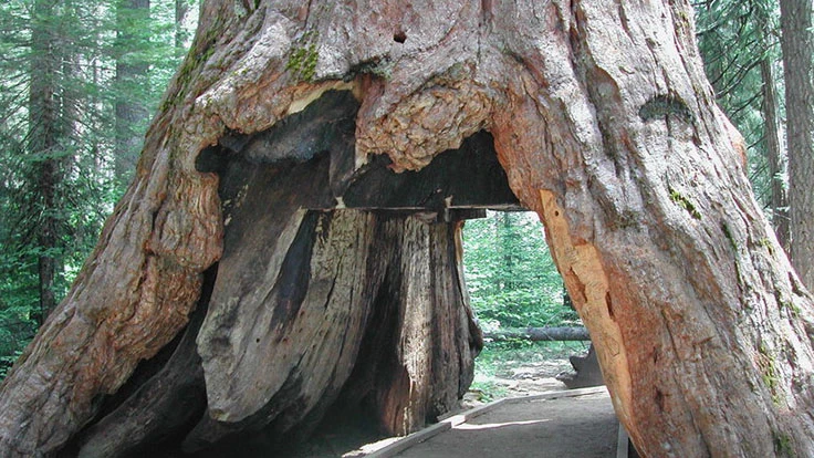 The "Pioneer Cabin Tree," a sequoia in Calaveras Big Trees State Park, saw horses and cars pass through it over the years. More recently, only hikers were allowed to walk through the massive tree.