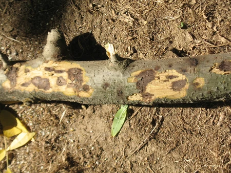 A new and deadly disease is affecting black walnuts across the western United States. Thousand Cankers Disease (TCD) is actually an insect and disease complex. It is caused by a tiny insect, the walnut twig beetle (Pityopthorus juglandis), which carries spores from a Geosmithia fungus as it goes about its feeding and breeding activities. The fungus causes many small cankers, or dead spots, to form, hidden underneath the bark.