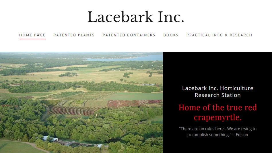 Lacebark, Inc. revamps its website with recent additions from Dr. Carl Whitcomb. Lacebark, located just outside of Stillwater, Oklahoma, is Whitcomb's plant development and horticultural research station.