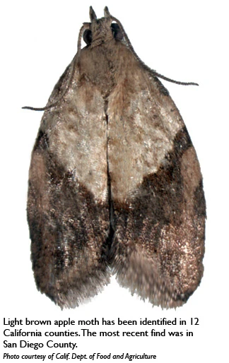 Growers in San Diego County could soon be battling another pest that has already been found in 11 other California counties. The North County Times reports that county and state agricultural officials trapped the county’s first light brown apple moth (Epiphyas postvittana) in Bonsall earlier this month. San Diego County agricultural commissioner Bob Atkins told the newspaper the discovery of a second moth in the area would lead to a quarantine that would extend 1½ miles in every direction from the site of the captured moth. The paper said county workers have hung additional traps in the area.