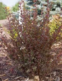 Little Devil features deep burgundy foliage throughout the season and clusters of small white-pink flowers in June. It grows up to 4 feet high and keeps its compact shape without pruning. It's hardy in USDA Hardiness Zones 3-7.
