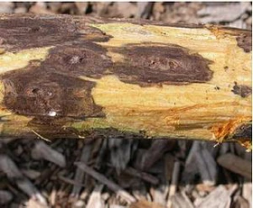 According to the VDACS, Thousand Cankers is caused by a fungus that is vectored by the walnut twig beetle. Adult beetles bore through the bark and deposit eggs. As the larvae hatch, they tunnel through the tree, introducing the fungus and causing cankers under the bark. The result is branch dieback, decline and eventual death of the tree.