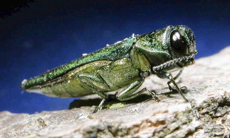 The adults don't do much more than nibble on leaves, but the larvae burrow under the bark and wreak havoc. Infested trees become unable to transport nutrients and begin to wither from the top down.