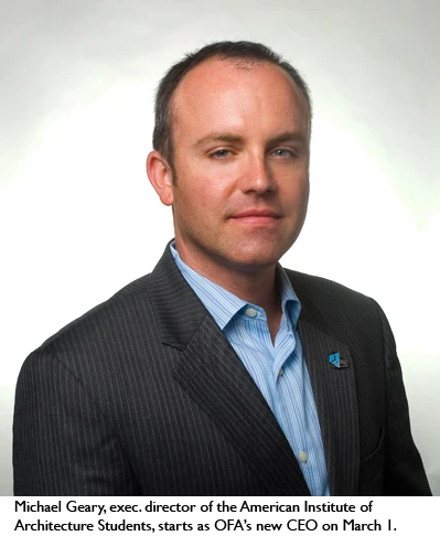 Michael Geary, exec. director of the American Institute of Architecture Students, has accepted the position of CEO of OFA, an Association of Horticulture Professionals. Geary will assume the new position on March 1.