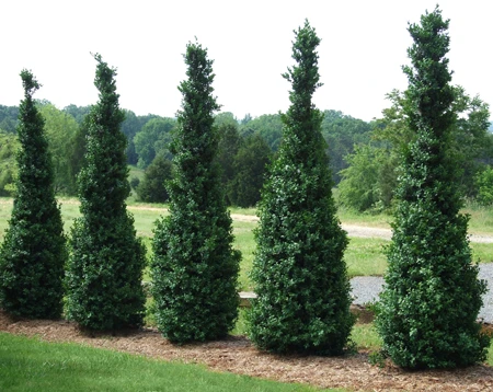 Dryopteris erythrosora ‘Brilliance’ (Autumn fern), Eucomis ‘Sparkling Burgundy’ (purple pineapple lily), Rudbeckia subtomentosa ‘Henry Eilers’ (sweet coneflower), Schizachyrium scoparium ‘The Blues’ (blue bluestem), Yucca filamentosa ‘Color Guard’, Corylopsis pauciflora (goldleaf buttercup winterhazel), Cercis canadensis ‘Hearts of Gold’ (Eastern redbud) and Buxus sempervirens ‘Dee Runk’ (American boxwood).