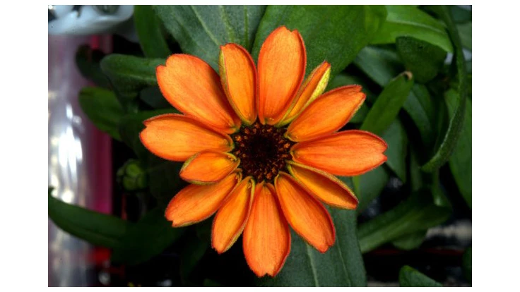 A brightly colored flower is the first zinnia to bloom in the International Space Station.