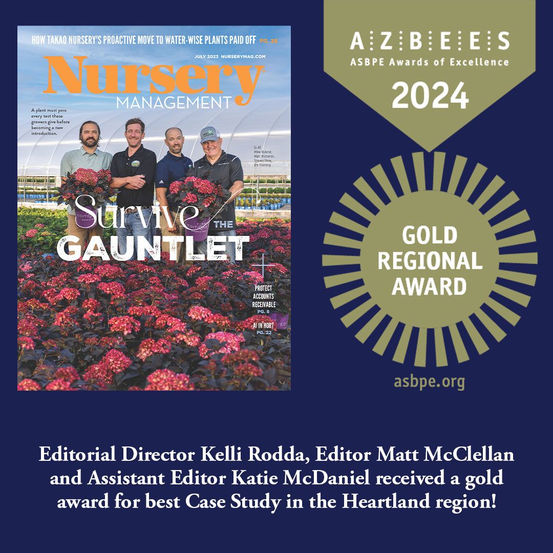 "We are proud to serve the horticulture industry by sharing the amazing stories of growers across the country and by keeping our readers informed on the latest breeding, industry news and production techniques," says the Nursery Management editorial staff.