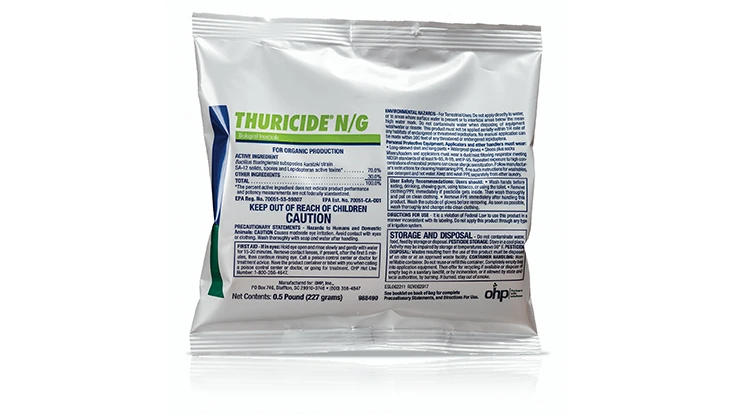 Thuricide N/G, derived from a naturally occurring bacteria, infects lepidopteran larvae and other insect larvae. Thuricide N/G contains the bacteria bacillus thuringiensis subspecies kurstaki strain SA-12.