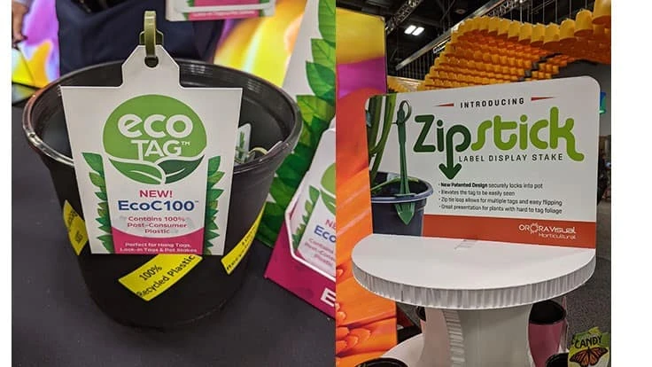 At Cultivate’21, Orora Visual introduced a new line of plant packaging made from recycled plastics. There are three options in the program. First, the EcoTag, which is made from 25-100% recycled plastics. Second, the ZipStick label display stake, which is made from 25-100% recycled plastics. And third is a 100% recycled black container that Orora Visual is offering as part of a partnership with Nursery Supplies.