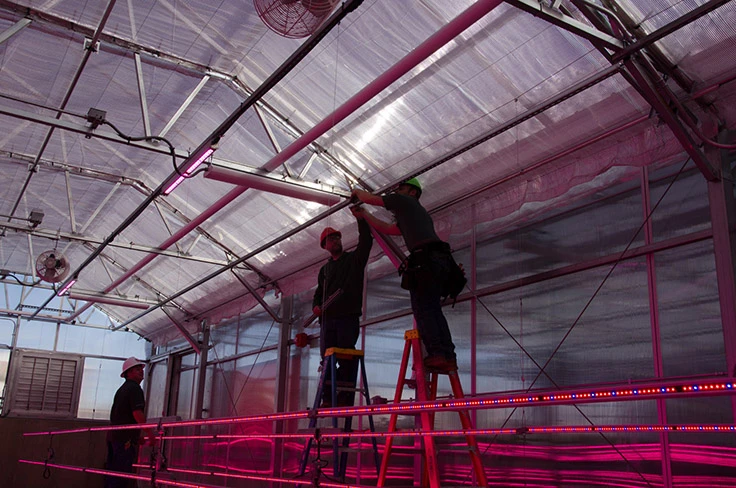 Photo: Technicians install LED toplighting in the new CSU horticulture center. Credit: Steve Newman