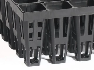 The Pot-in-Frame system is injection molded and constructed in the U.S. The pots, which are available to buy without the frame, are 3.25 inches deep. The elevated design keeps the pots away from the ground and puddles, which reduces chance of disease. The pots can be lifted out of the frame individually for grading, trimming, grafting, spacing and other tasks.
