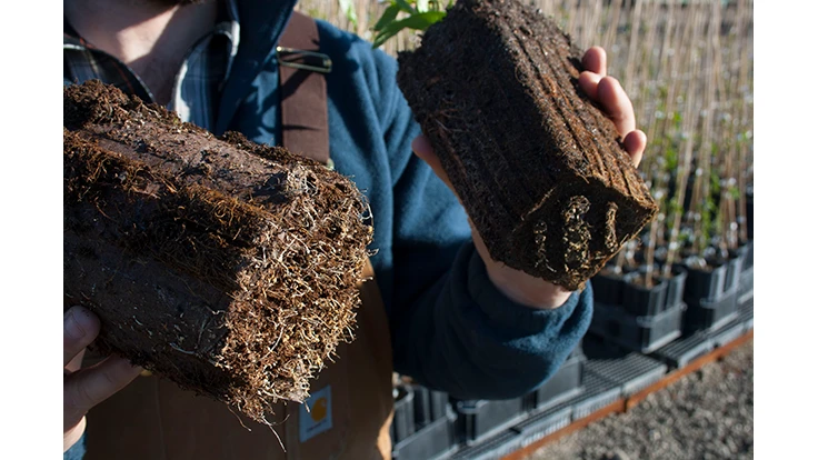 The Ellepot at this point – even 6 months-plus down the line – is still going strong, holding the roots and media together. This means a plant can be boxed and shipped out as-is. The young plant then gets placed directly in the ground and the Ellepot is left to degrade in the soil. Not a single piece of plastic has to leave the nursery, saving thousands of dollars every year in plastic. This also reduces the chance of disease, as plastic is not being returned from outside of the nursery from who knows what kind of conditions.