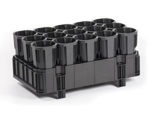 The material is injection-molded plastic and includes a 12 x 20 inch tray and 15 removable sleeves. Each sleeve holds an 8 inch Ellepot with a 80 mm diameter. The tray holds a more shallow, 4 inch, 80 mm Ellepot. The system is compatible with mechanization, making it a good fit for traditional nurseries or nurseries that have incorporated automation into production tasks. The sleeve can be lifted out manually or mechanically, and slots easily into the tray. There are several version of tray available. Visit the web site for more information.