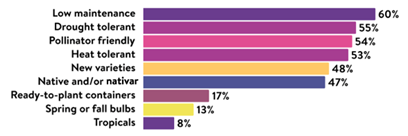 More than half of consumers say they’re looking for more low-maintenance and drought- and heat-tolerant plants, as well as eco-friendly options like native/nativar plants and pollinator-friendly picks. Nearly half also said they’re looking for more new varieties at retail.