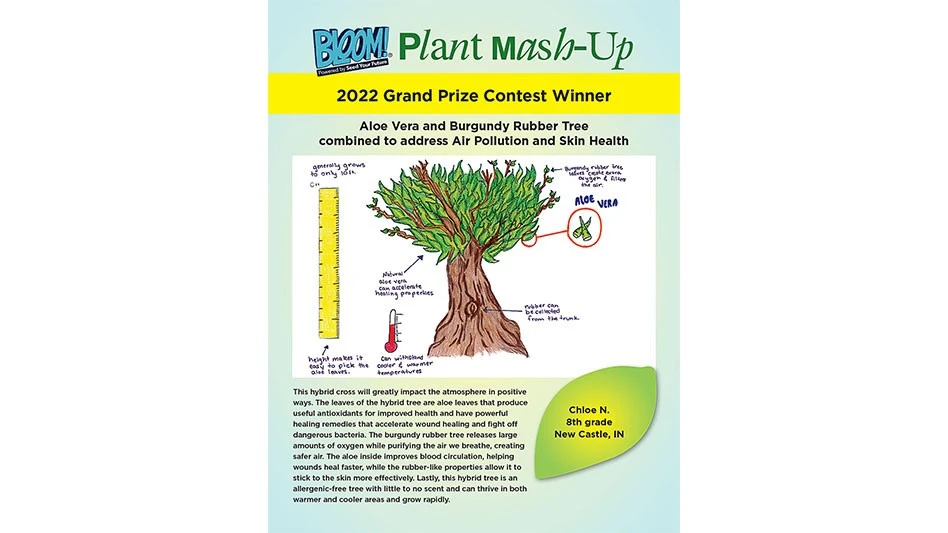 This year’s first place winner is Chloe Grace N., an eighth-grader from New Castle, Indiana. She combined an aloe vera plant and a burgundy rubber tree to address air pollution and promote wound healing. “The leaves of the hybrid tree are aloe leaves, which produce useful antioxidants for improved health, and have powerful health remedies that accelerate wound healing, as well as fighting off dangerous bacteria,” she wrote in her entry.